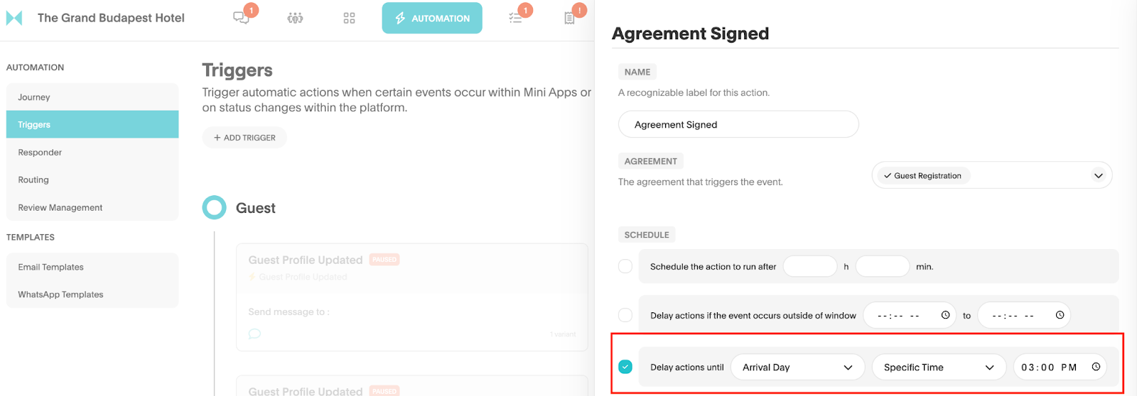- Checkmark “Delay actions until.” First drop down= “Arrival Day.” Second drop down= “Specific Time.” Select your preferred time in the last drop down.
