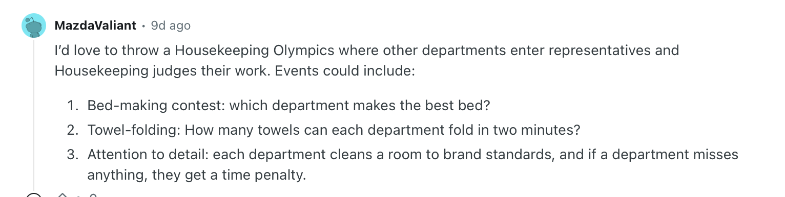 Gamifying recognition: an idea for Housekeeping Olympics where departments compete in bed-making, towel-folding, and detail inspections (source: r/AskHotels).