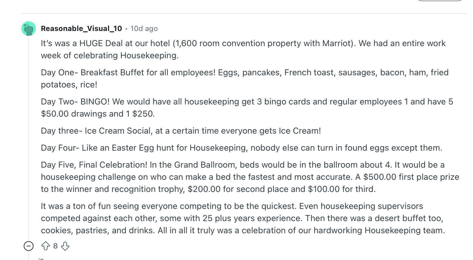 Example of how a 1,600-room convention property celebrated Housekeeping Week with daily activities and recognition events (source: r/AskHotels).