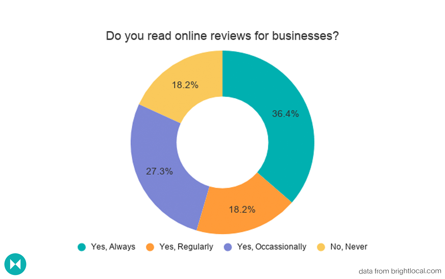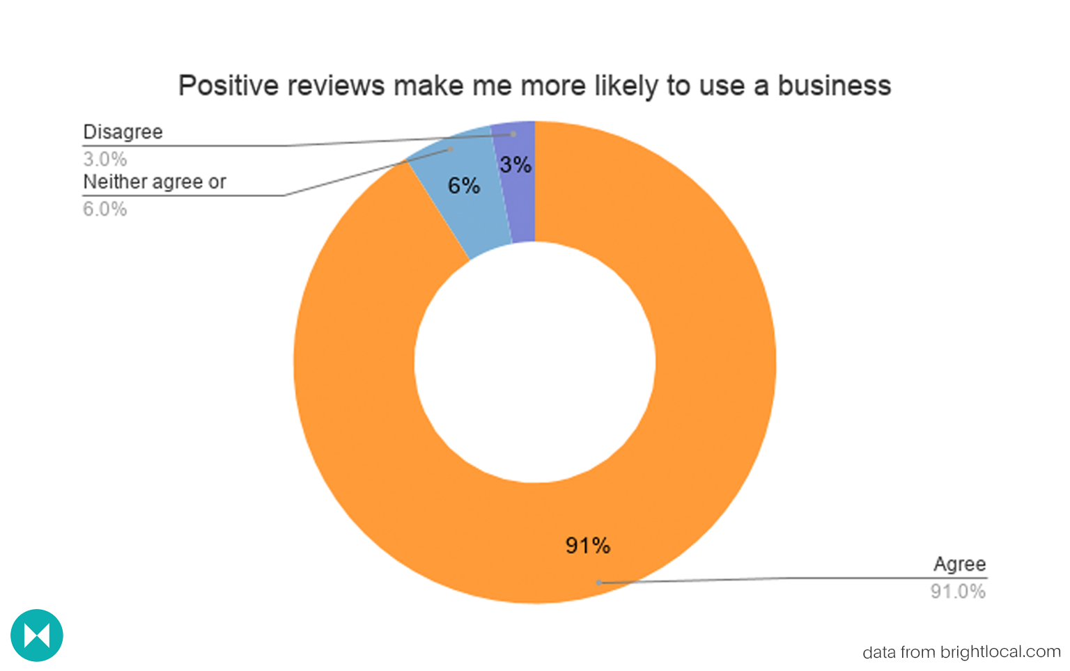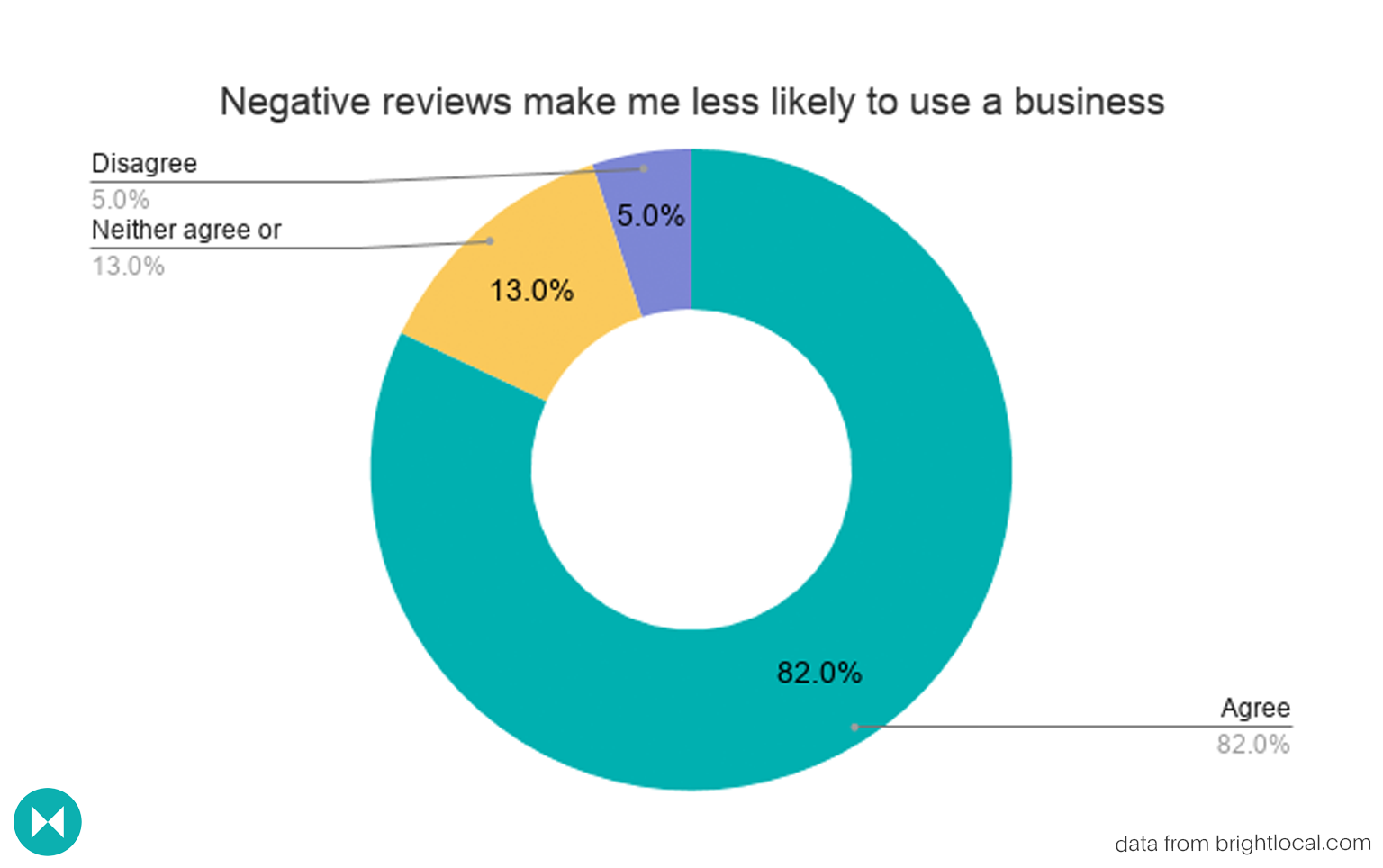 You’re not alone if you chose the restaurant with 4.5 stars over the one with 2.5 stars. According to a study by BrightLocal, 82% of consumers read reviews for local businesses before making decisions, and around 91% of people said they were more likely to use a business if it had more positive reviews. The opposite is also very prevalent—82% of consumers say that negative reviews turned them away from using a business. The exact star rating also matters; only 53% of people would even consider using a business with less than a 4-star rating, so it’s crucial for any business to maintain a rating above 4-stars.