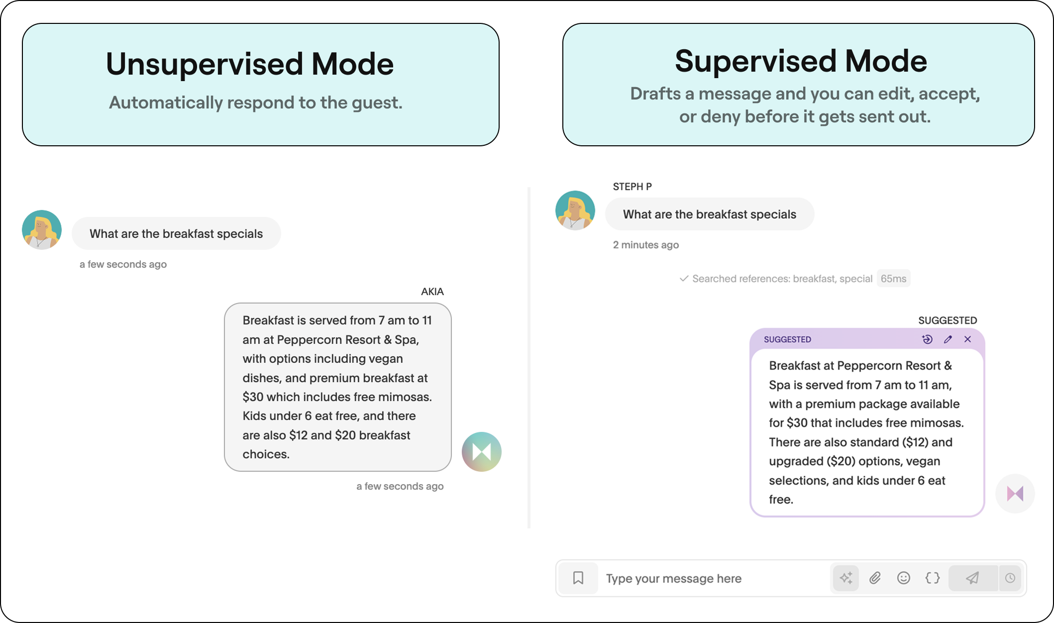 Worried about handing the reins to AI? Akia makes it safe to start with Supervised Mode. In this mode, the AI drafts a response, but your team has the option to review, edit, or approve it before anything is sent. Once you’re confident, you can take off the training wheels and switch to Standard Mode, where the AI responds automatically.