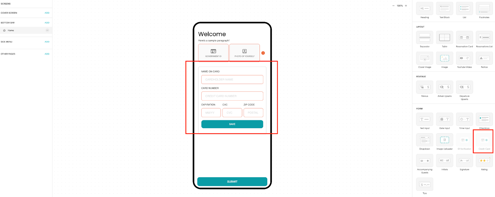 - Under Form, drag and drop the Credit Card component into the Mini App