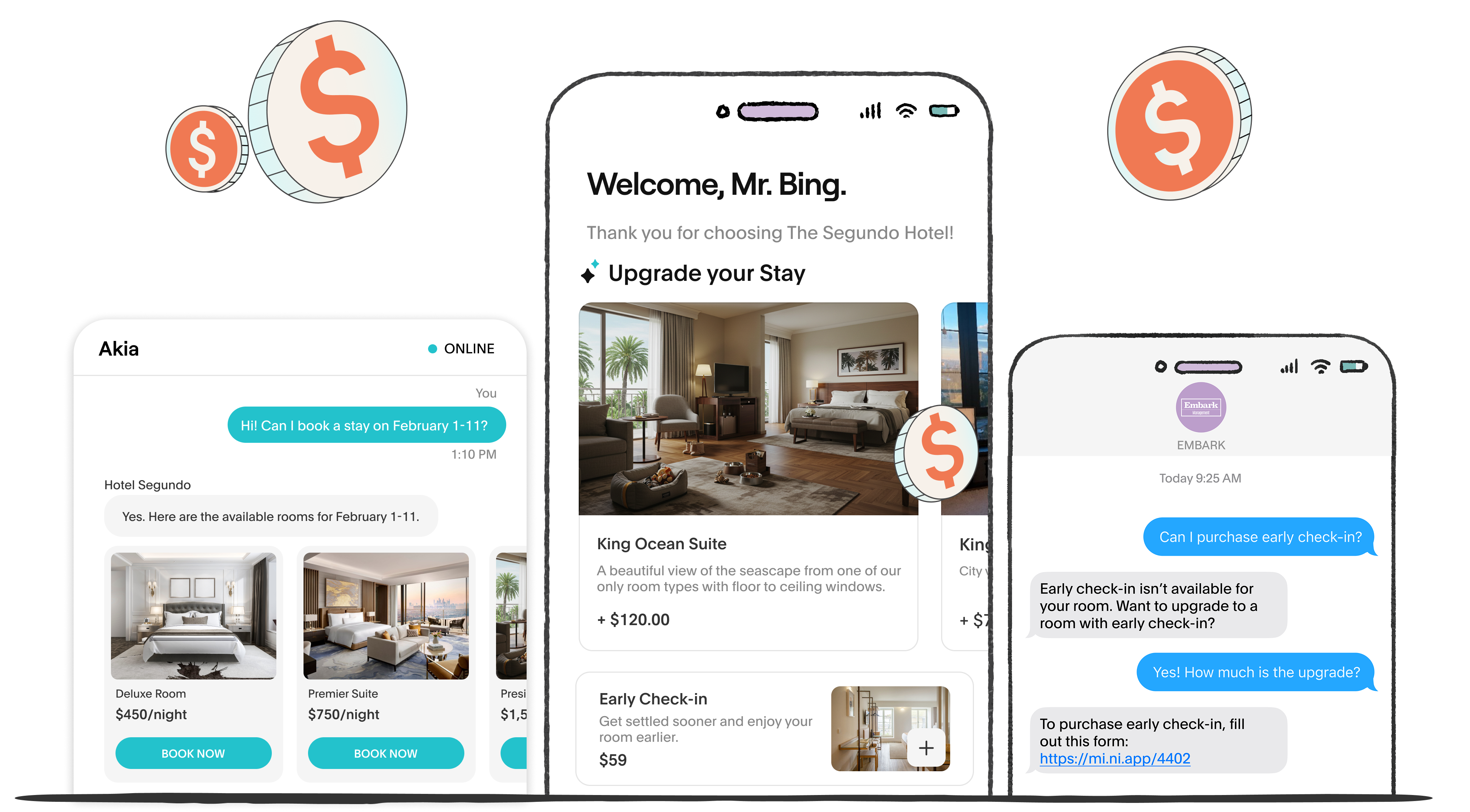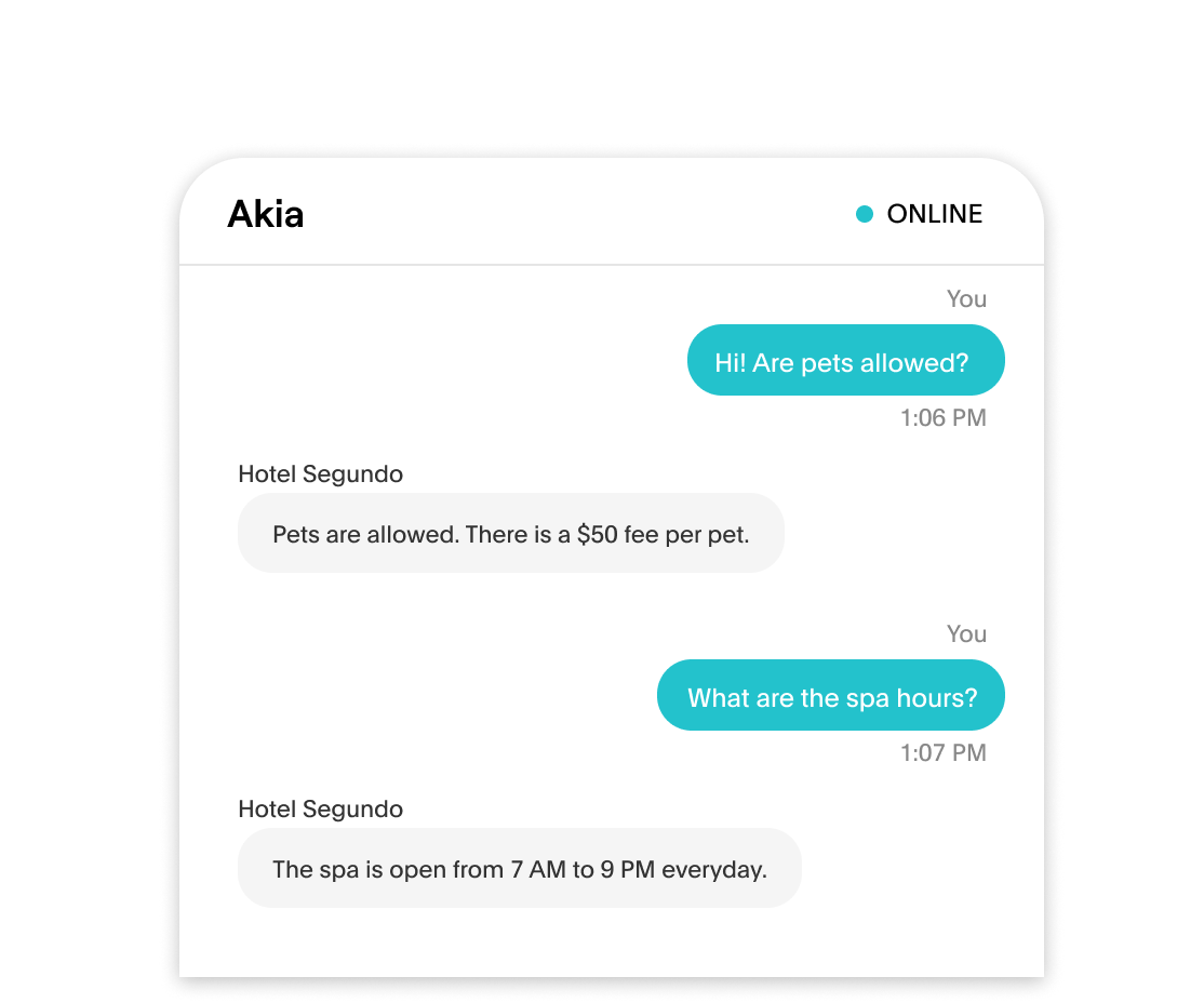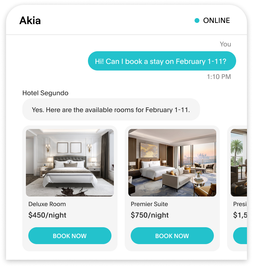 Travelers can ask about availability and property information, and Akia will present options and direct links to book.